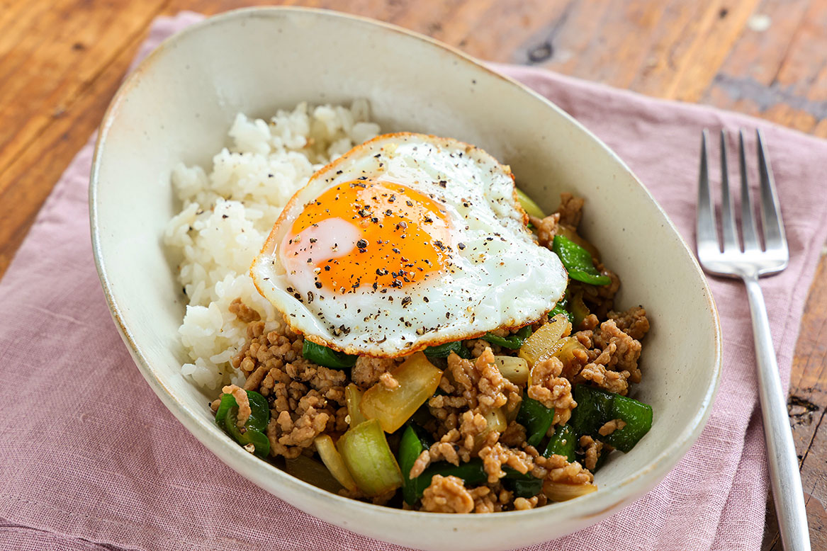 器にごはんを盛り、3と2をのせ、粗びき黒こしょうを振る。