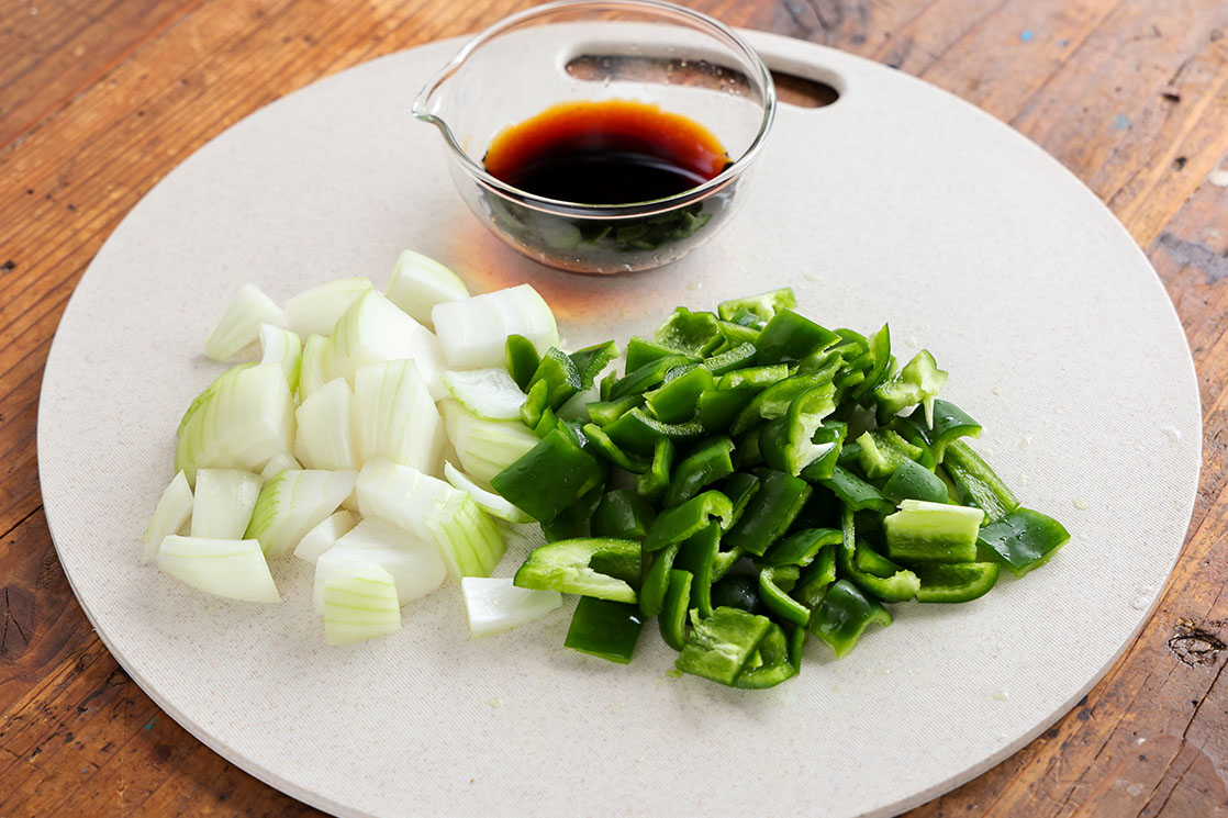 ピーマンと玉ねぎは1.5cm角に切る。Aは合わせておく。