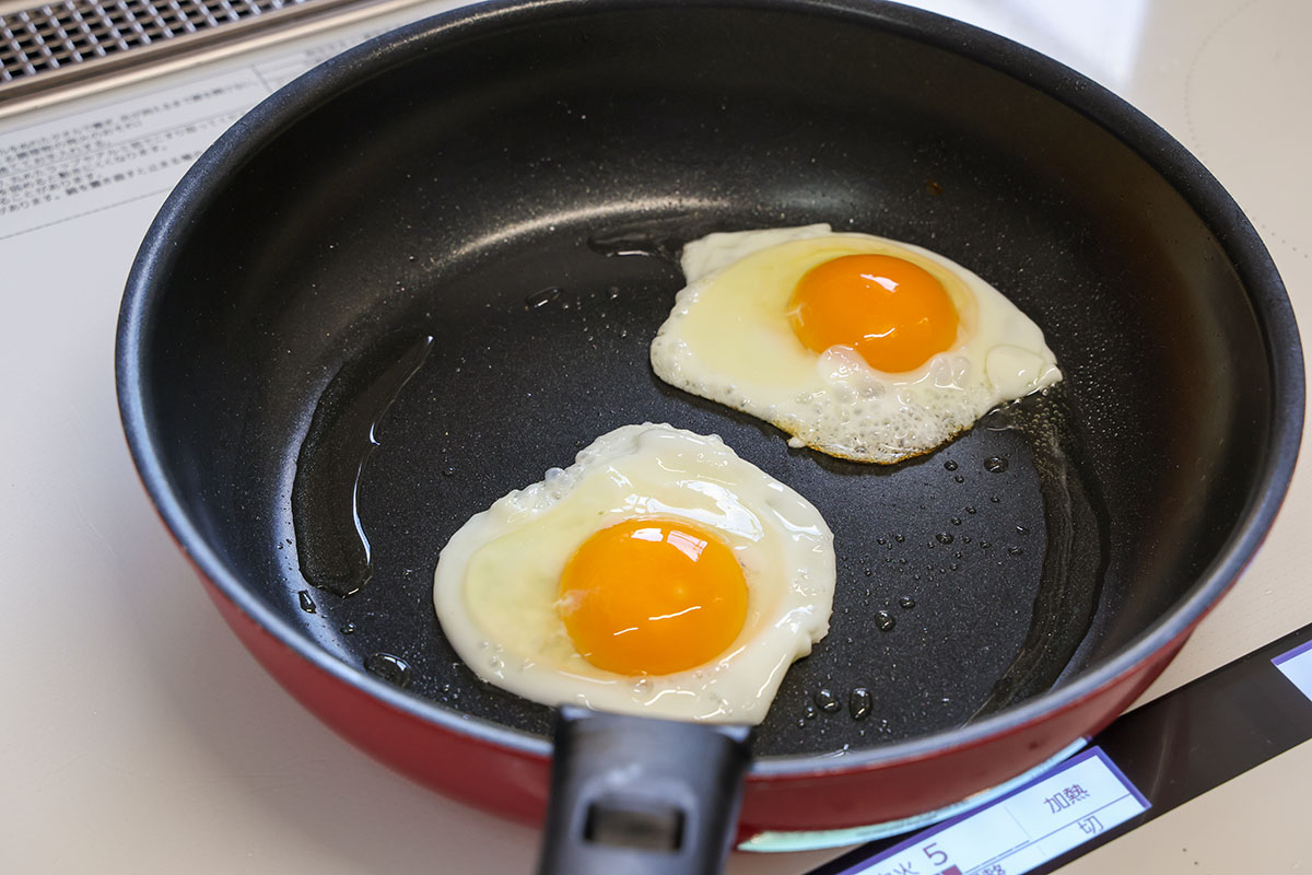 フライパンにサラダ油を中火で熱し、卵を割り入れ、目玉焼きを作り、取り出しておく。