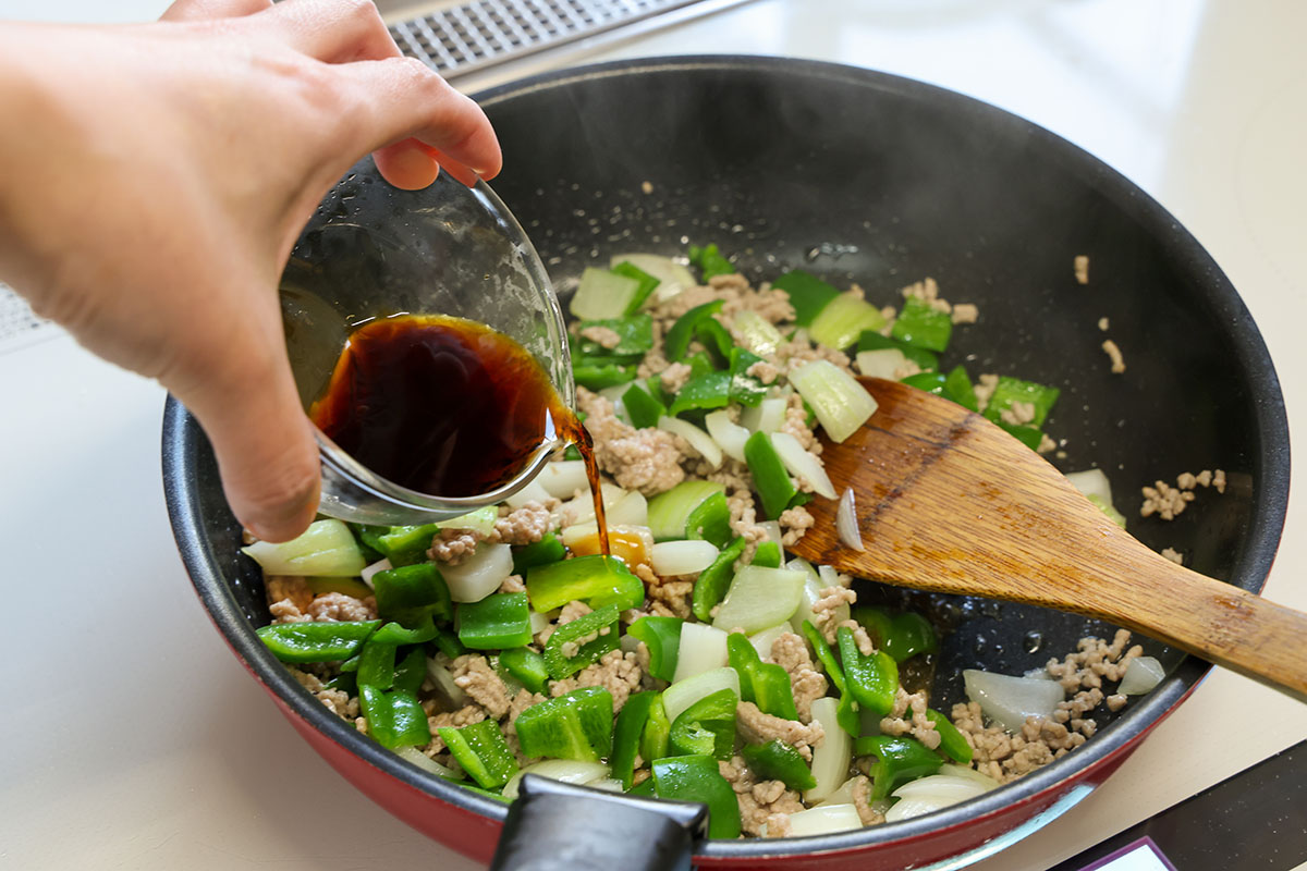 色が変わったらピーマンと玉ねぎも加えて炒め、火が通ったらAを加えて煮からめる。