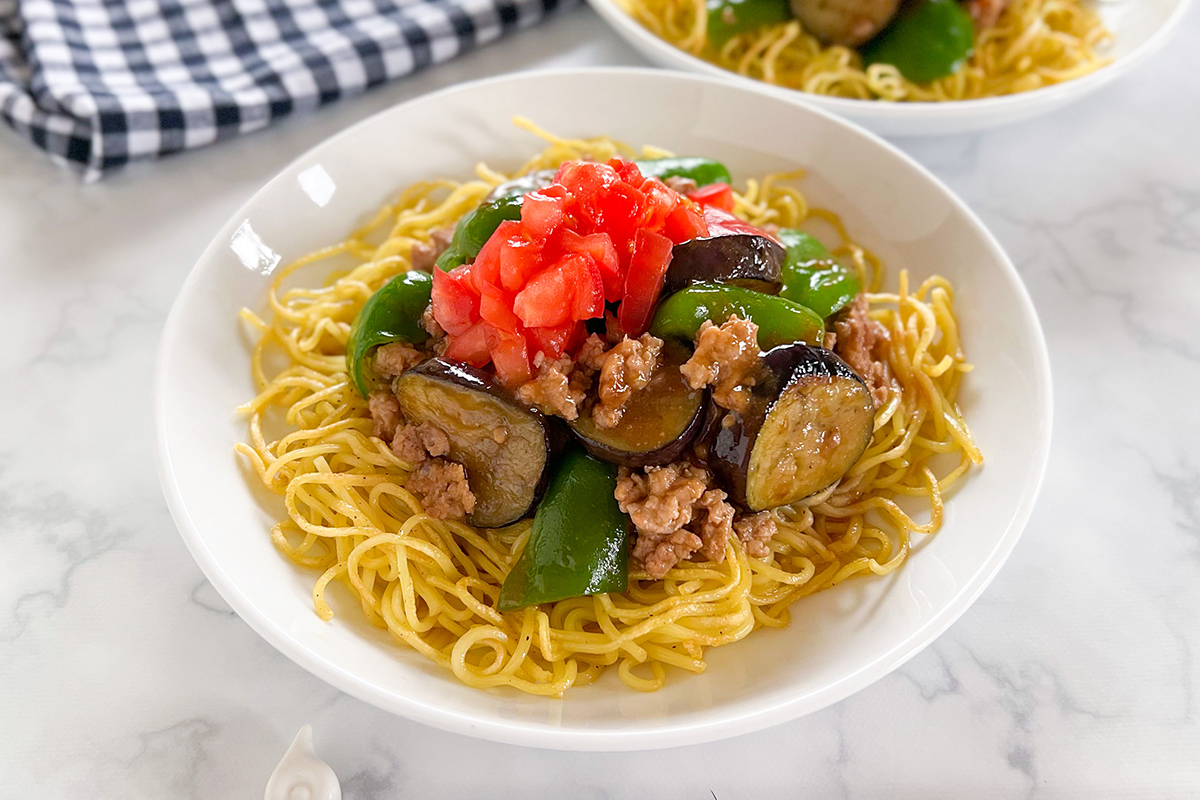 野菜たっぷりで栄養満点!こく旨肉味噌と夏野菜を麺にしっかり絡めて美味しくいただけます。