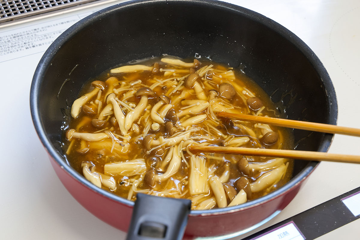 そのままのフライパンできのこを炒め、しんなりしたらAを加え、混ぜながらとろみが付くまで加熱する。