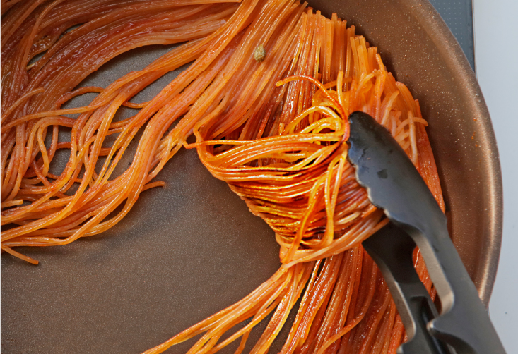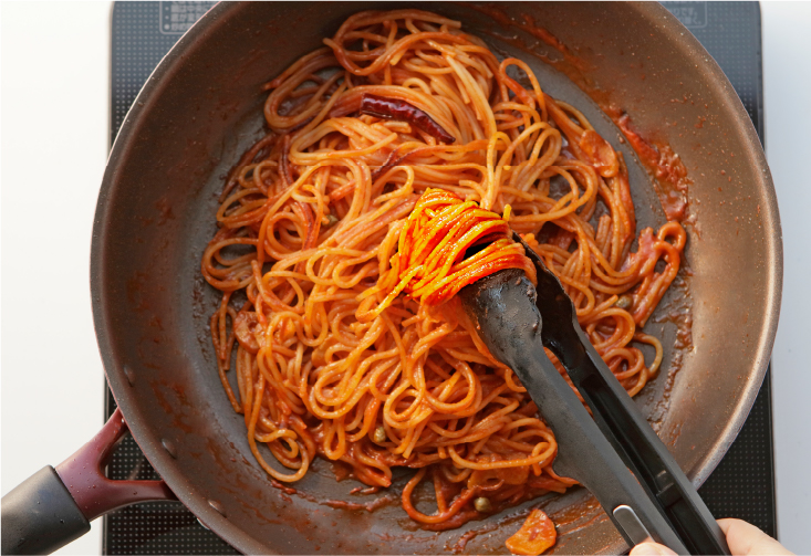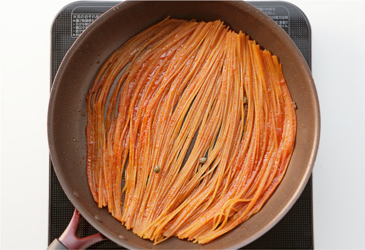 トマトスープをスパゲッティにしみ込ませて、水分を飛ばすように焼き上げていくのがポイント。