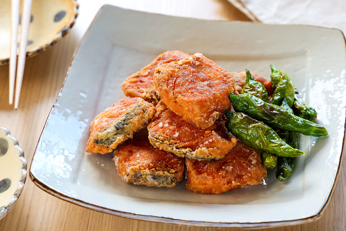 鮭は3~4等分に切り、Aをからめて10分おき、片栗粉をまぶす。しし唐辛子は包丁で2~3カ所穴を空けておく。
