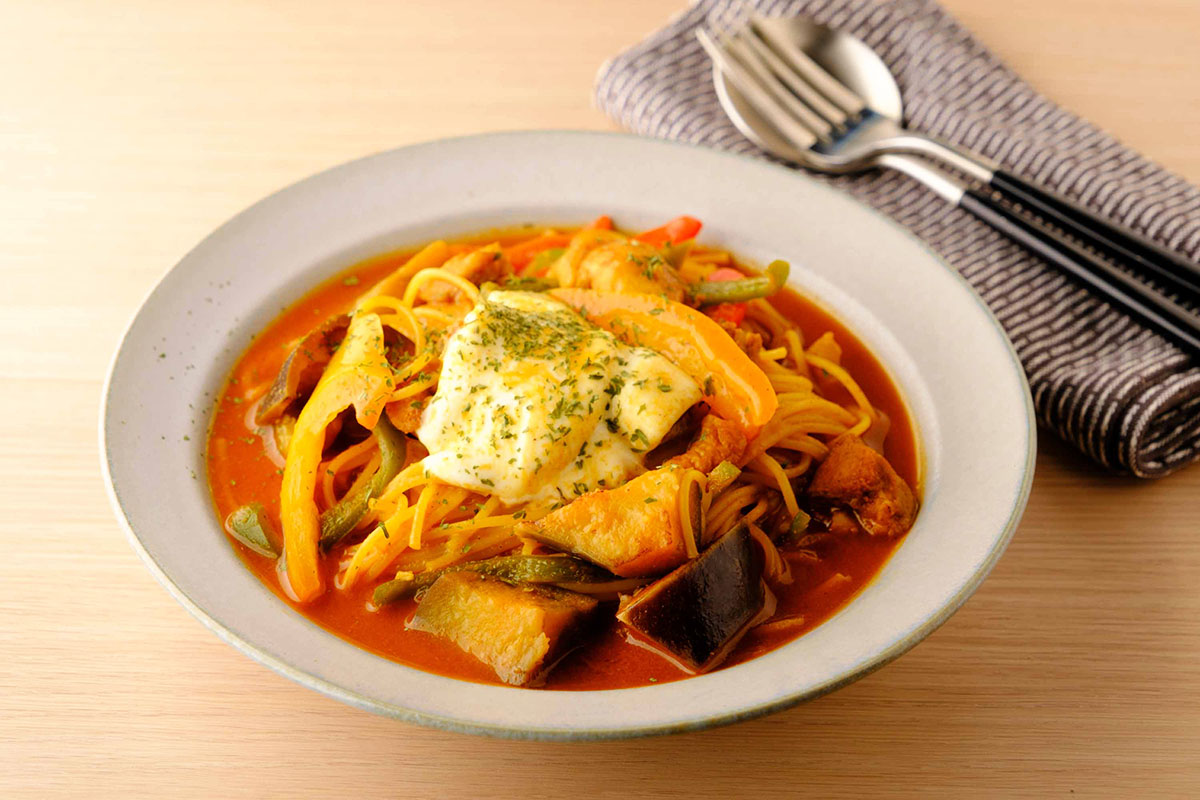 フタを外して全体を混ぜ、スパゲッティと具を器に盛ったらモッツアレラチーズをのせ、上からスープをかけてパセリ(乾燥)を散らす。