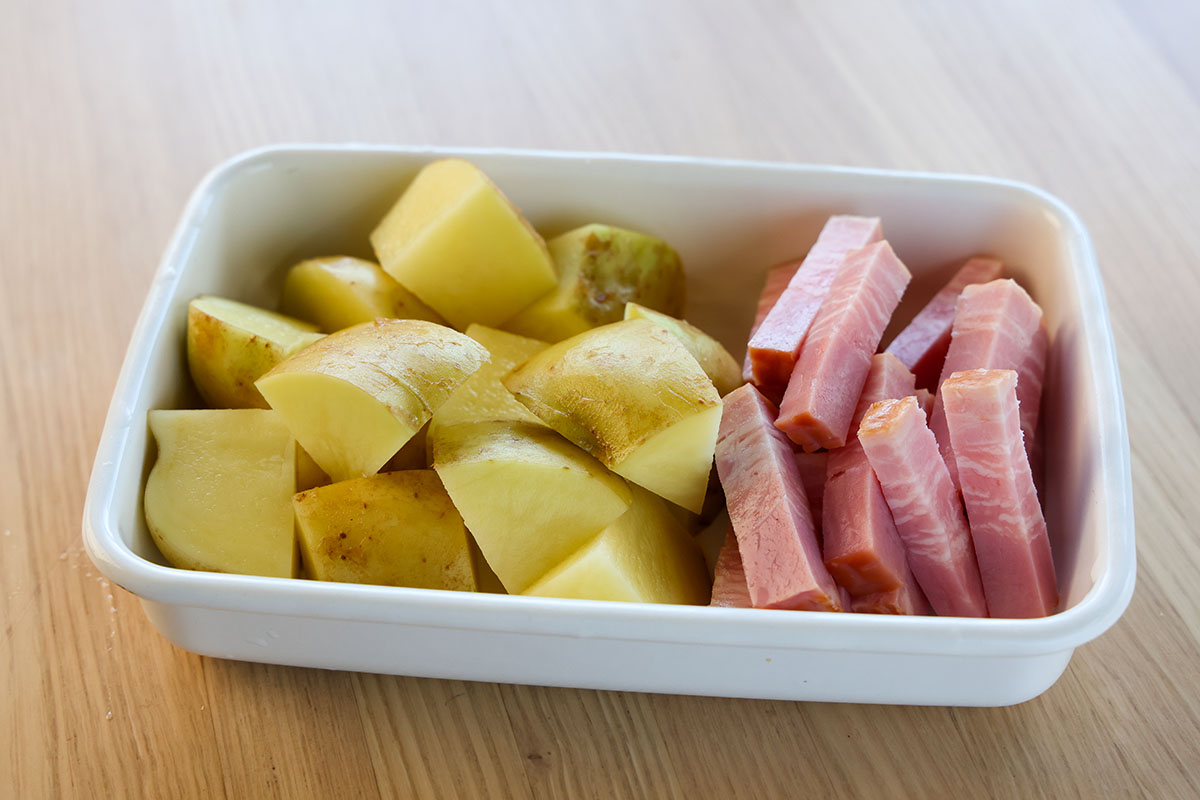じゃがいもは皮付きのままよく洗って4cm大に切る。ベーコンは1cm角の棒状に切る。