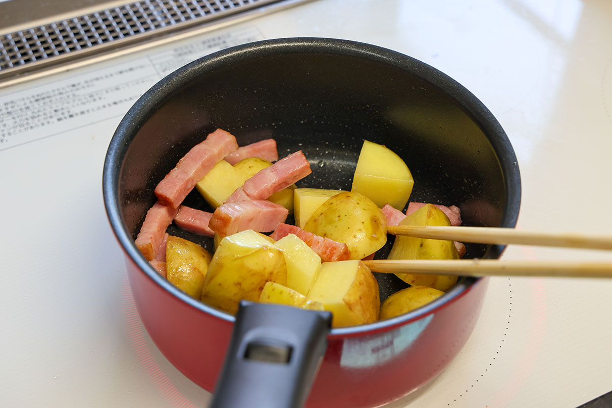 鍋に油を中火で熱してベーコンを炒め、うっすら焼き色が付いたらじゃがいも加えてさっと炒める。