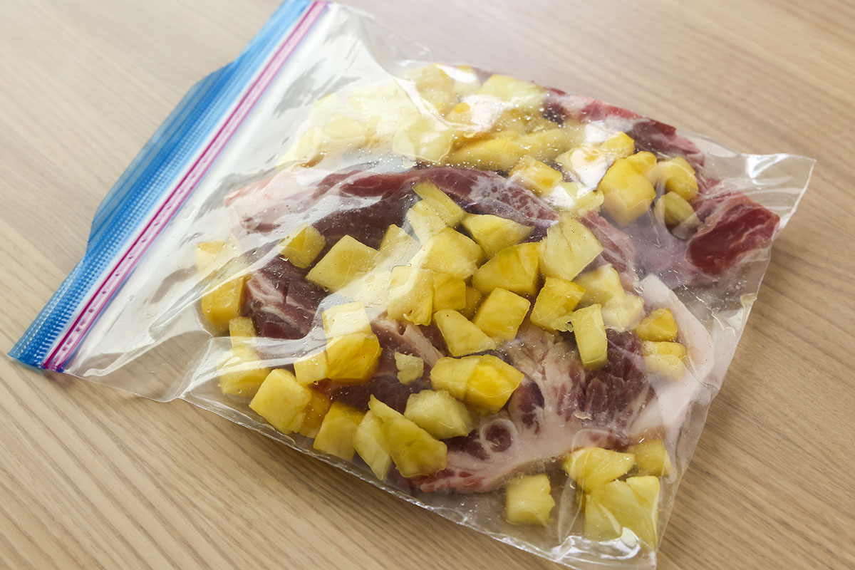 パイナップルの酵素が働き、豚肉が驚くほどやわらかく仕上がりますよ♩