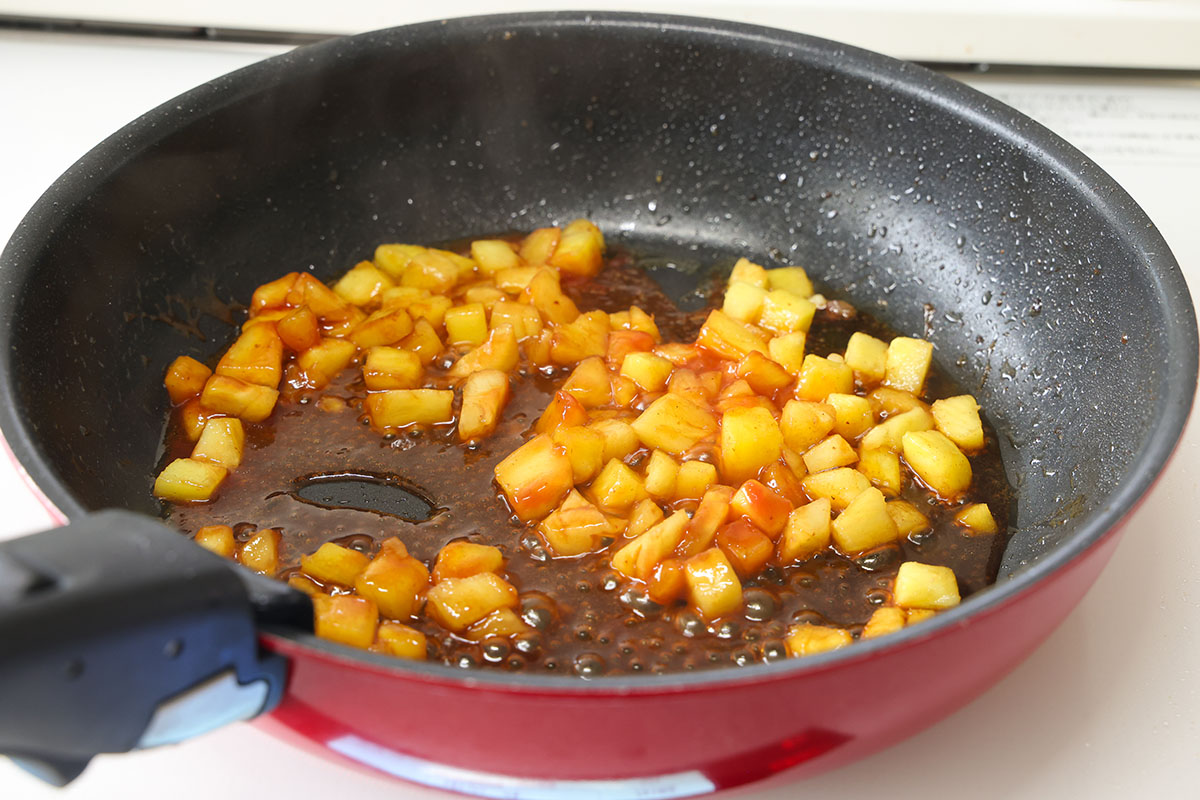 そのままのフライパンに2のパイナップルを入れ、中火でさっと炒める。Aを加えて少し煮詰め、豚肉にかける。