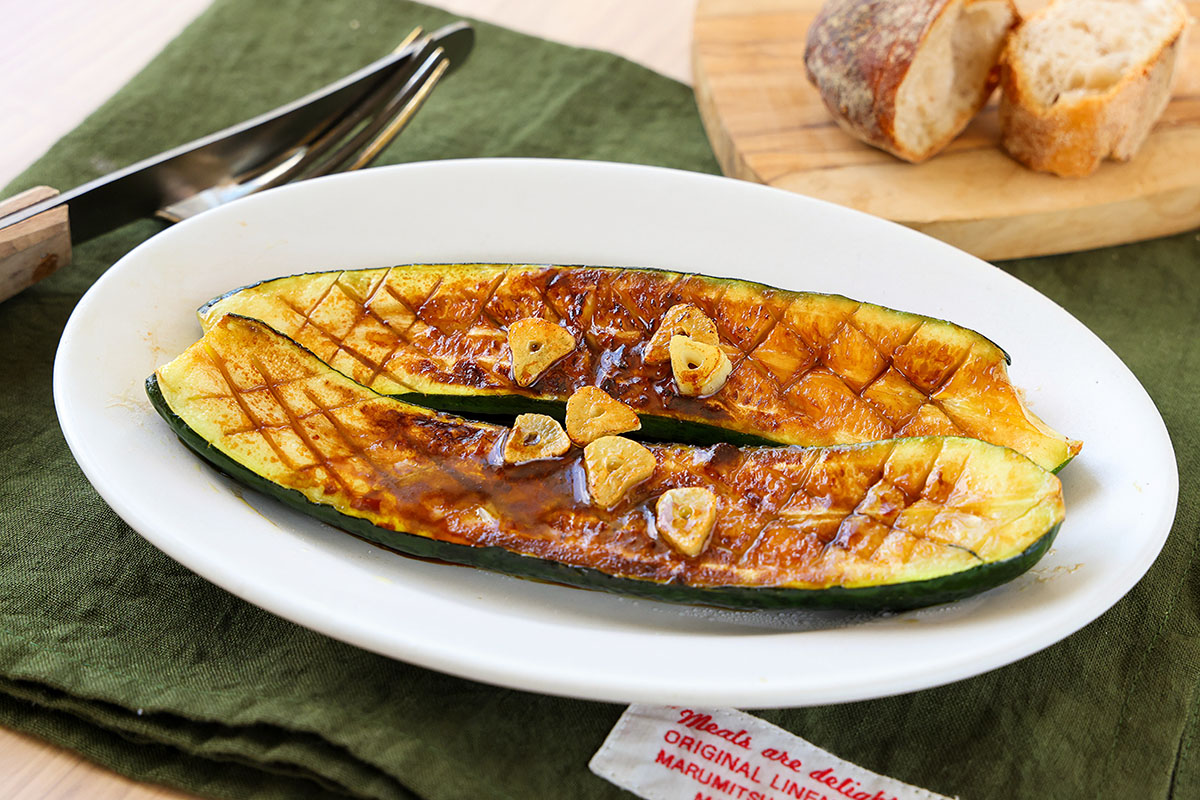 ・ズッキーニに切り込みを入れておくことで火が通りやすく、たれも絡みやすくなります。