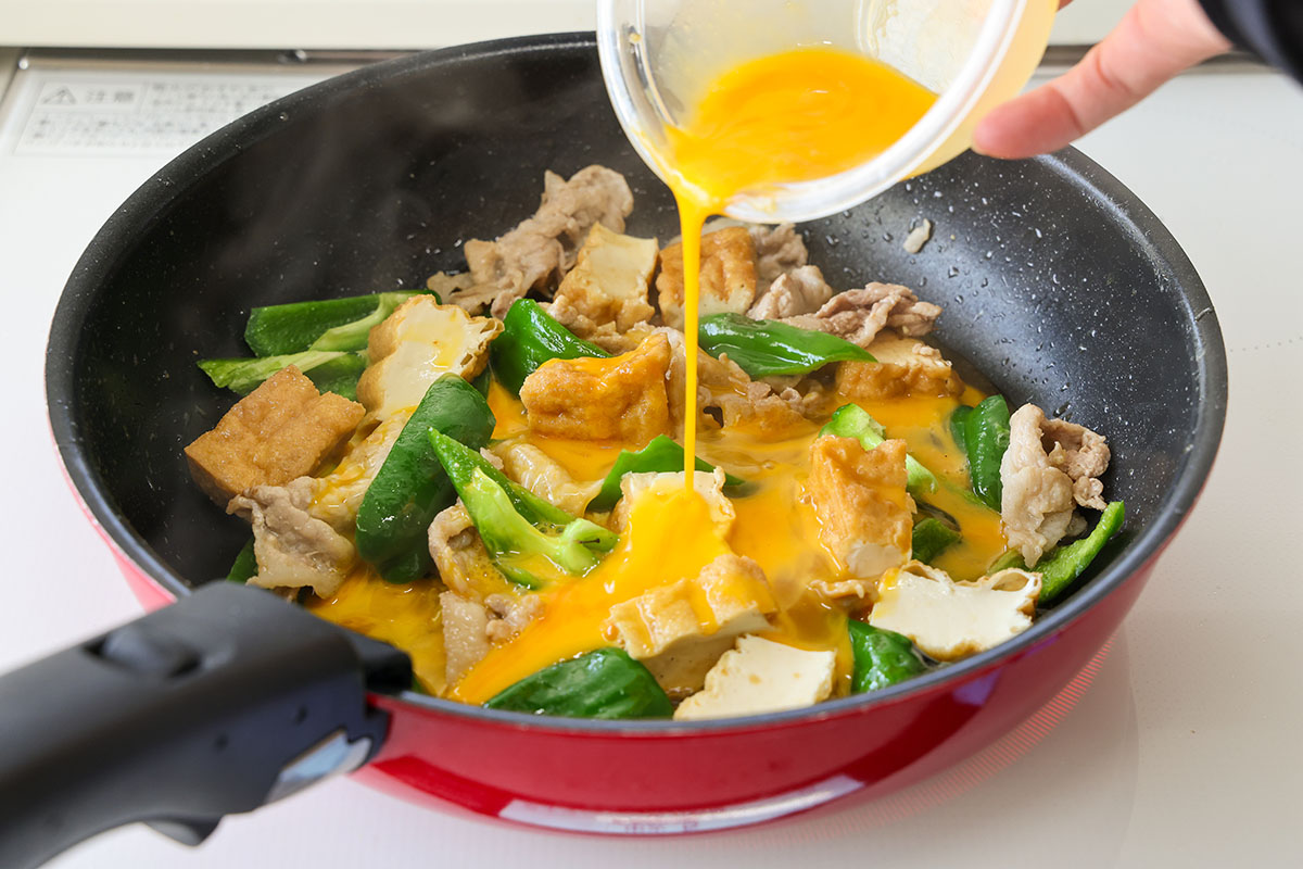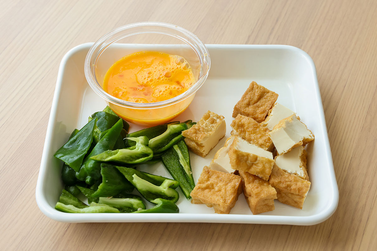 厚揚げとピーマンは一口大に切る。卵は溶きほぐす。