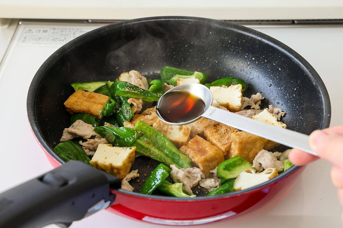 フライパンにごま油を中火で熱して豚肉を炒める。色が変わったら厚揚げとピーマンも加えて炒め合わせ、Aを加えてさっとからめる。