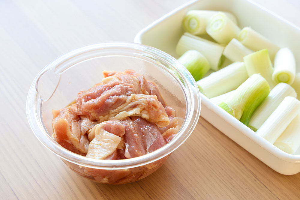 鶏肉は3cm大に切ってAを揉みこむ。長ネギは3~4cm長さに切る。