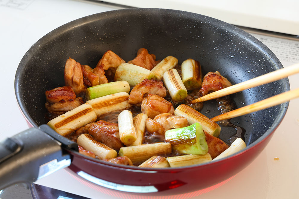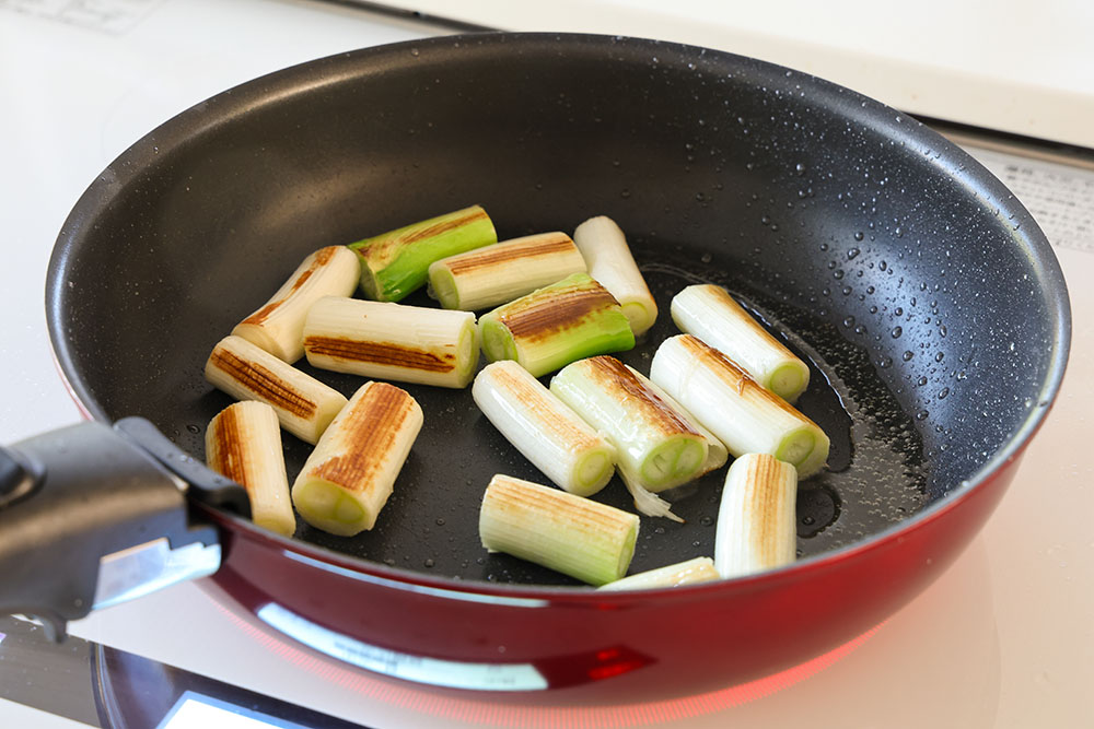 フライパンに油を中火で熱し、長ネギを返しながら焼き、両面焼き色が付いたら一旦取り出す。