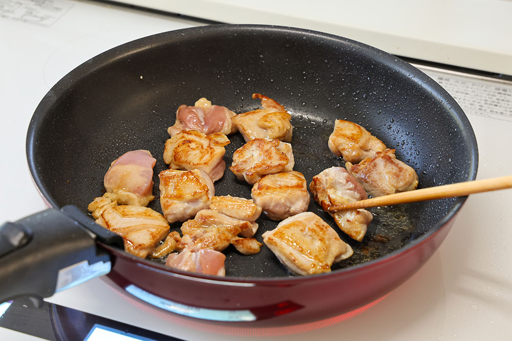 そのままのフライパンで鶏肉を皮目から焼く。焼き色が付いたら裏返し、裏面も焼いて火を通す。