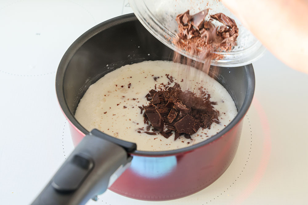 鍋に牛乳を入れて中火にかける。沸とう直前で火を止め、チョコレートと砂糖を加えて混ぜて溶かす。次にゼラチンも加えて混ぜて溶かす。