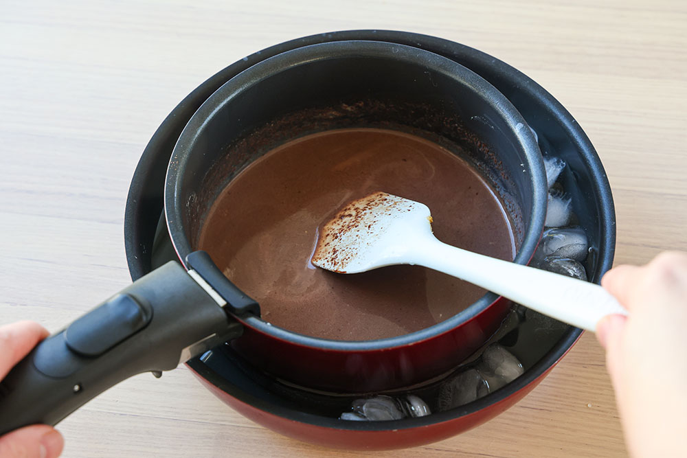鍋底を氷水に当て、混ぜながら冷やす。とろみが付いたら容器に注ぎ、冷蔵庫で3時間以上冷やす。
