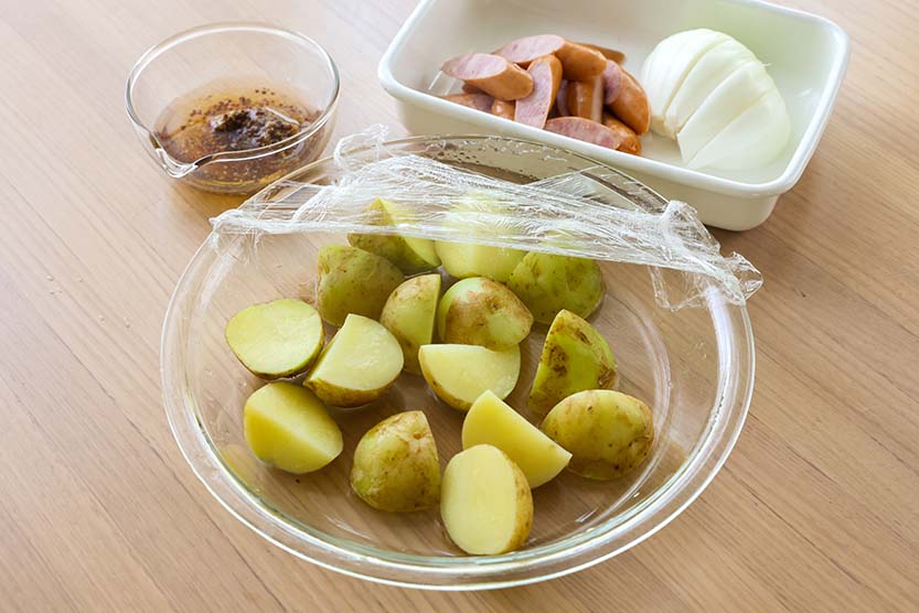 じゃがいもは皮ごと4cm大に切り、耐熱皿に並べてふんわりラップをかけ、600Wのレンジで5分加熱する。