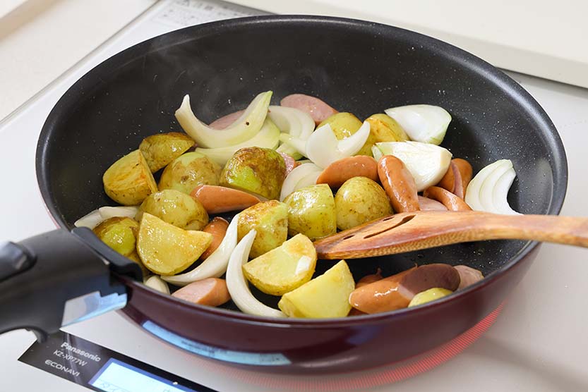 フライパンにオリーブ油を中火で熱し、じゃがいもを返しながら焼く。全体に薄く焼き色が付いたら玉ねぎとソーセージを加えて炒める。
