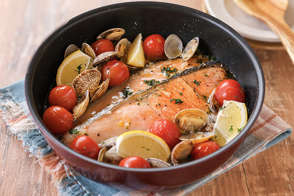 鮭を裏返し、まわりに冷凍あさり、ミニトマト、【A】を加えて煮立たせる。ふたをして弱火で7〜8分蒸し煮にする。