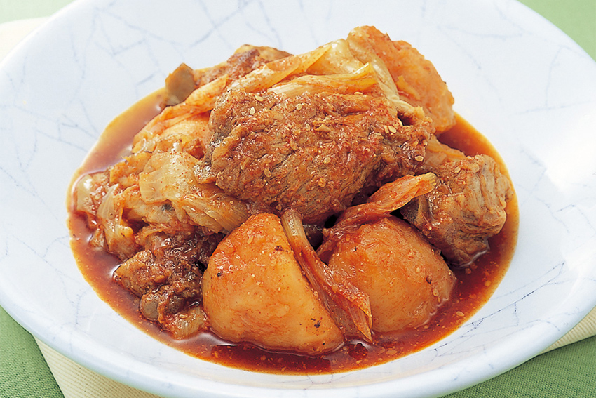 調理鍋にごま油を熱し、スペアリブを焼き、酒を振り入れ、2の材料と<煮汁(A)>を入れ炒め合わせる。さらにゆで汁2カップを加え沸とうさせ、アクを取りながら10分加熱する。