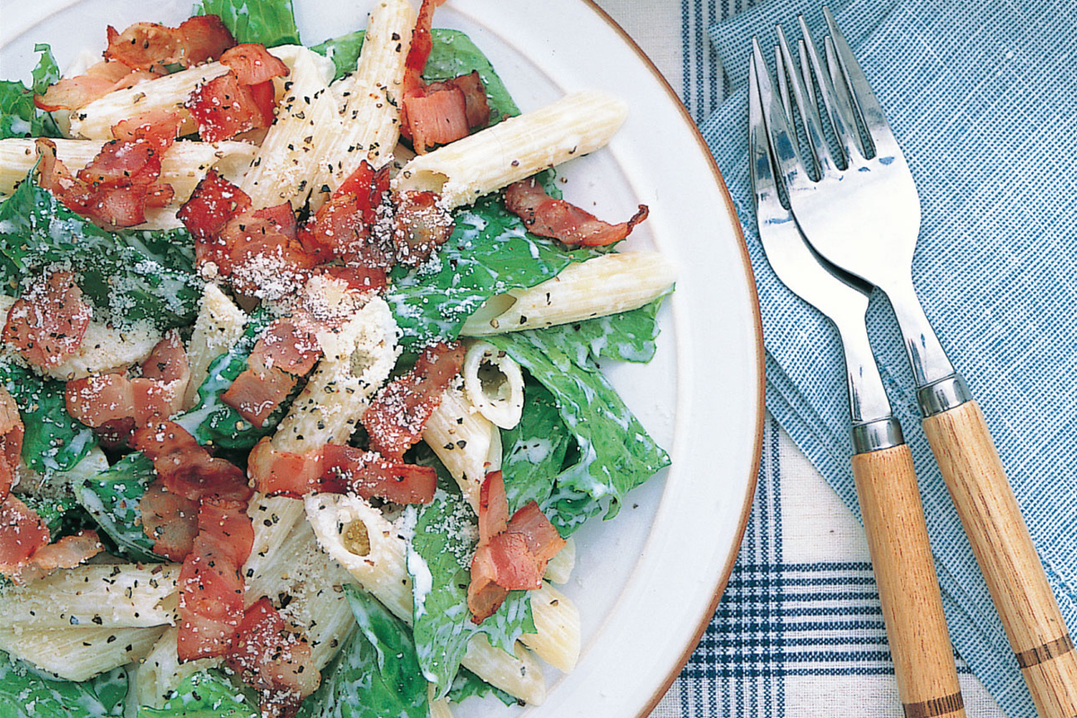 ペンネが冷めたら、ロメインレタス、ベーコン、Aの残りを加えて混ぜ合わせ、粉チーズをふる。