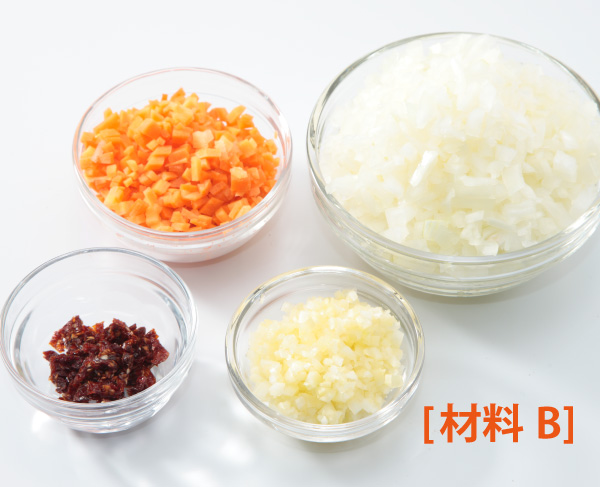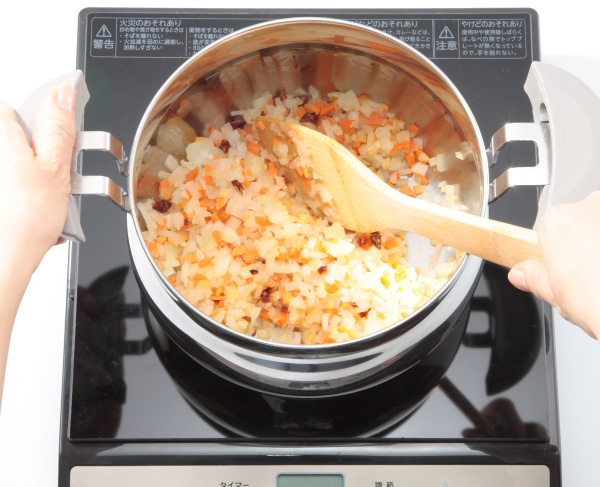 調理鍋にオリーブオイルをひき、材料Bの野菜を焦がさないよう、よく炒める。