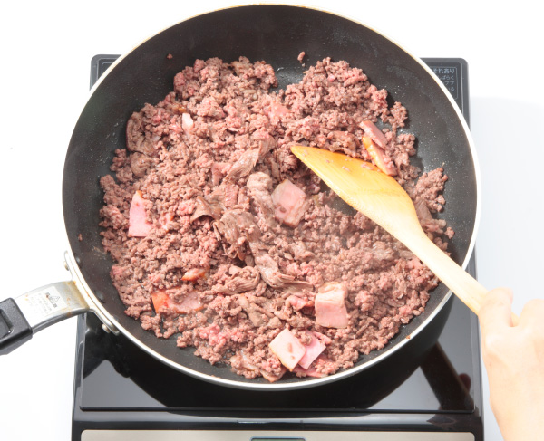 材料Aの肉類を入れ、1.砂糖/2.アンチョビペースト/3.塩/4.黒こしょう(A)の順に加え、色が変わる程度に炒める。