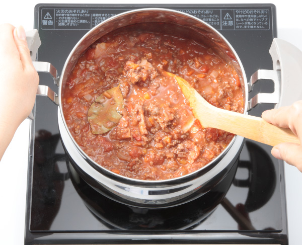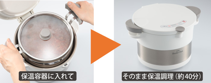 調理鍋を火から下し、保温容器にセットして約40分保温する。