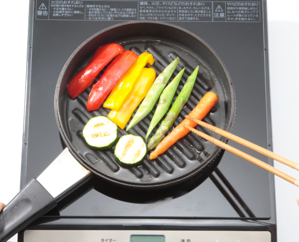 保温調理の時間を見計らって、パスタを茹で、ロースト野菜を準備する。厚めにスライスした野菜をオリーブオイルを温めたフライパンで丁寧にローストする。焼き目がついたらお好みでほんの少々塩をふる。(塩を加えなくてもOK。)