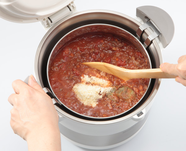保温調理が終わったら、仕上げに粉チーズと黒こしょう(B)を加え、軽く混ぜ合わせる。