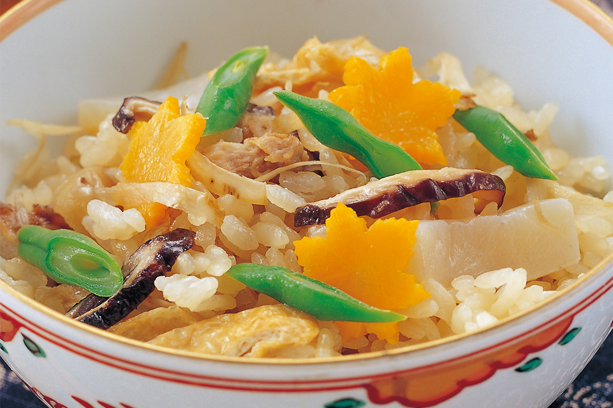 炊き込みごはんにさやいんげんを散らし、器に盛りつける。