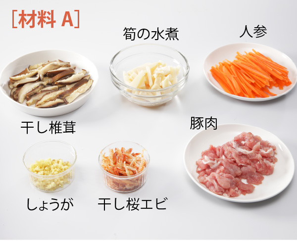 材料Aの人参は千切りに、豚肉は1cm程の細切りに、筍の水煮は0.5cm厚のいちょう切りに、しょうがはみじん切りにする。干し椎茸は水で戻し、軸を切り落とし0.5cm程の細切りにする。戻し汁は300ml取りおく。