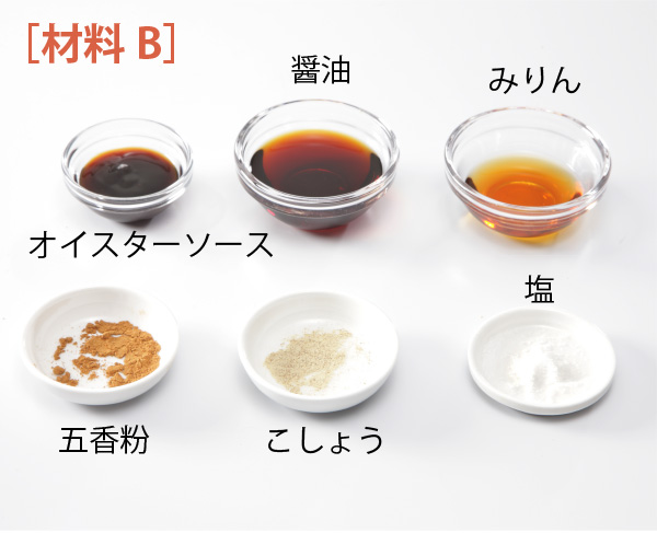調理鍋にごま油を入れ、材料Aと材料Bを加え中火で軽く炒めたら一旦火を止め具材を取り出して置く。(※具材を取り出した調理鍋は洗わないでOK)