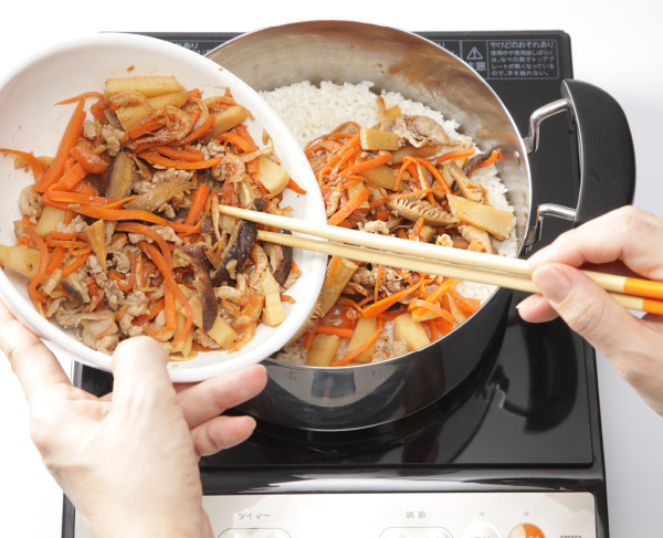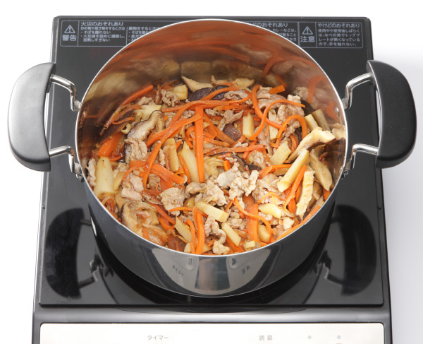 1のもち米を調理鍋に入れ、戻し汁と鶏がらスープを加える。ふつふつと沸とうし始めたら中火で2分、4の具材を入れフタをして弱火で9分加熱する。(※火が強いと焦げてしまうので必ず弱火で加熱する)