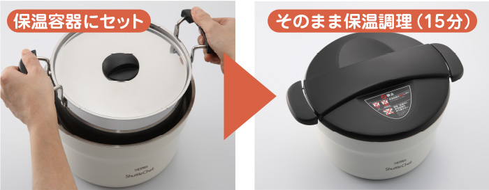 調理鍋を火からおろして保温容器にセットし、15分保温する。