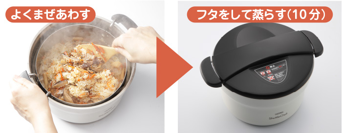 所定時間経過後、良くまぜ合わせる。再びフタをして10分蒸らす。