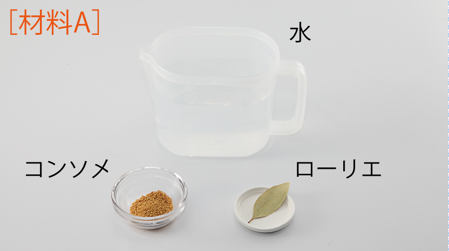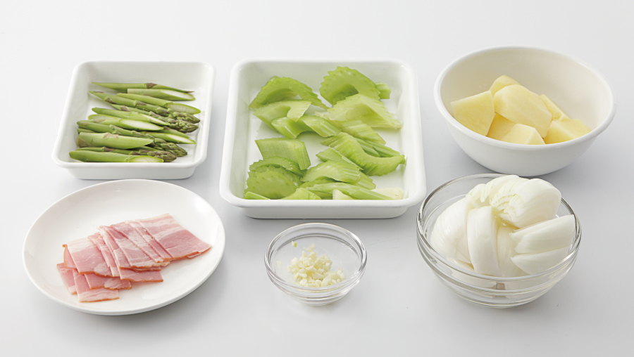 [材料A]を切っておく。セロリは約1.5cm幅に、新玉葱はくし形切り、じゃがいもは皮と芽を取り除き1/8に切り水にさらす。ベーコンは3cm幅に切り、アスパラは斜めに4等分に切っておく。
