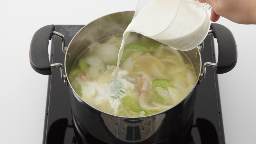 沸とうし始めたらアクを取り、牛乳を入れ、さらに加熱する。再度沸とうしたら火を弱めて5分加熱し火を止める。