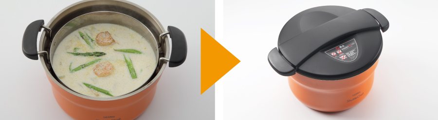 調理鍋を火から下ろし、保温容器にセットして約15分保温する。