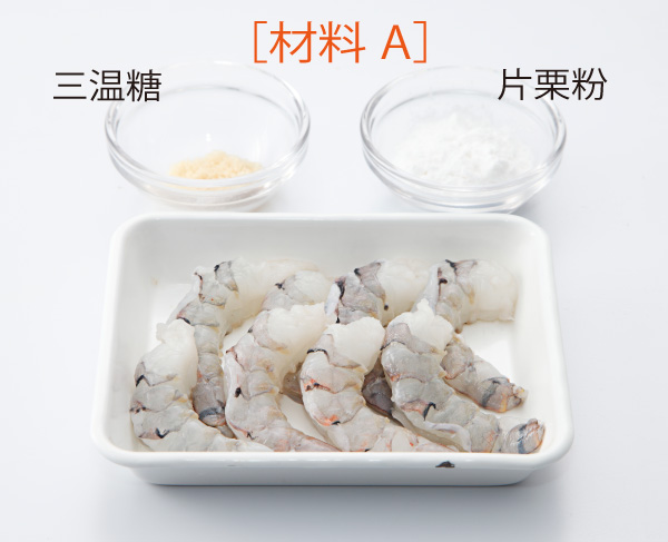 エビの背わたをとり片栗粉をまぶし冷水で洗う。キッチンペーパーで水分をとり、[材料A]をまぶしておく。