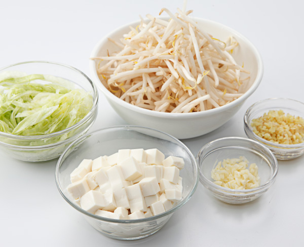 しょうが、にんにくはみじん切りにしておく。豆腐は1cm角のさいの目切り、レタスは千切りにする。もやしは軽く水で洗っておく。