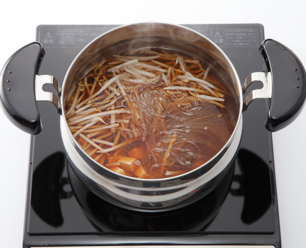 調理鍋に豆腐、もやし、春雨と[材料C]を入れ中火で加熱する。