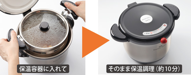 調理鍋を火から下ろし、保温容器にセットして10分保温する。
