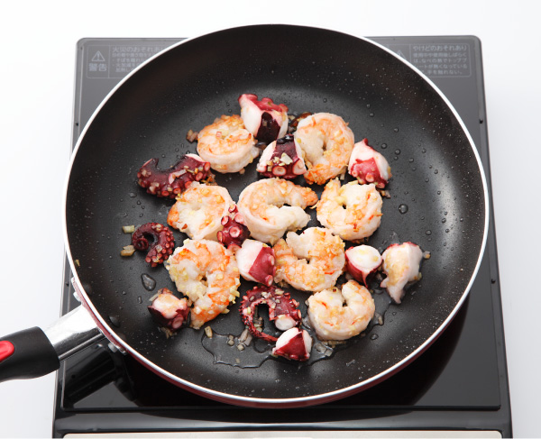 保温調理している間に、フライパンに太白油をしき、1のしょうがとにんにくを加えて油に香りをつけ、タコとエビを加え軽く炒める。