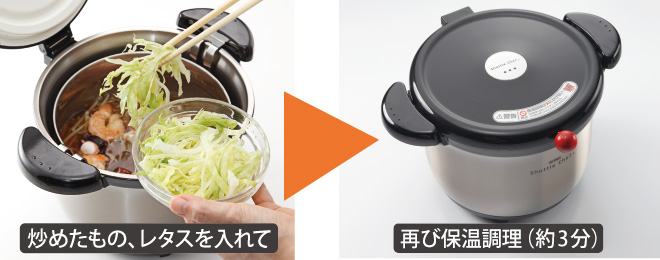 炒めた物を保温調理中の鍋の中にレタスとともに加え3分保温調理する。