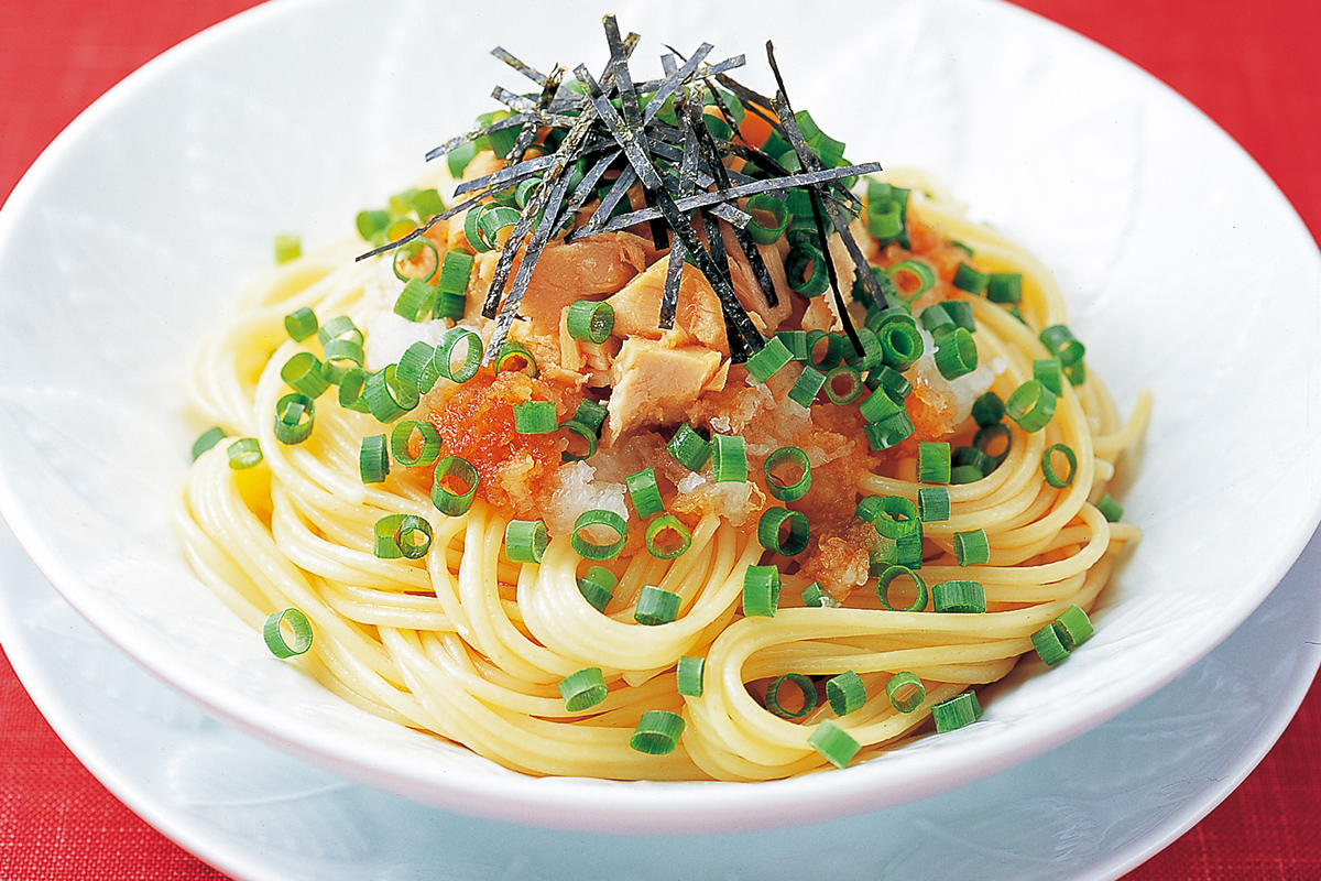 器にゆでたてのパスタを盛って 1 をのせ、小口切りにした万能ねぎときざみのりを散らし、好みでめんつゆか、しょうゆを適量かける。