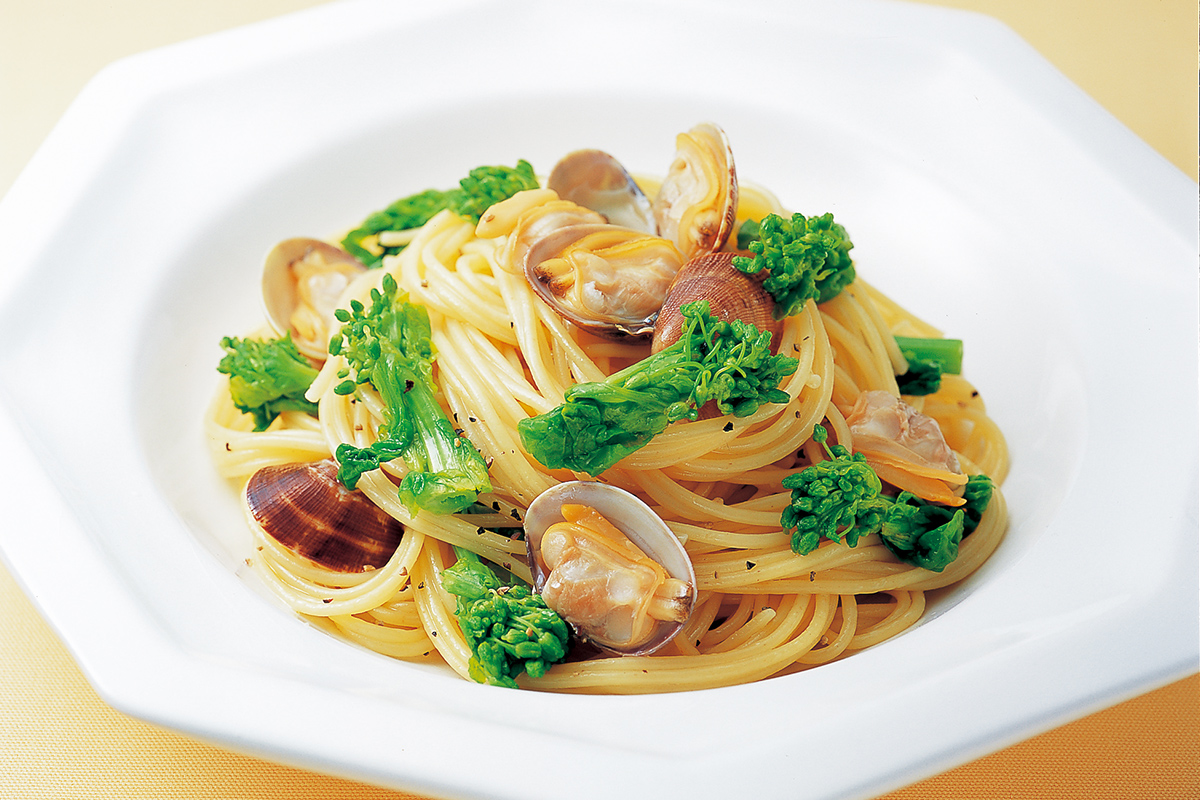 フライパンにオリーブオイル、にんにく、赤唐辛子を入れて弱火にかけ、にんにくが薄く色づいて香りがでたら、あさり、白ワイン、菜の花を加え、ふたをして中火で7~8分蒸し煮にする。あさりの口が開いたら火を止める。