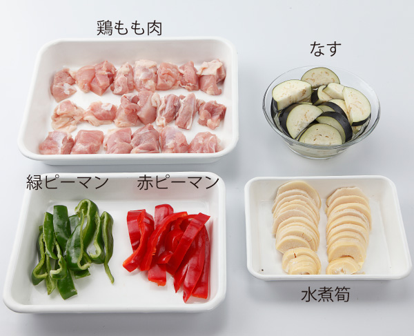 鶏もも肉を2cm幅程度に切り塩こしょうをふっておく。なすとたけのこは1cm幅の半月切り、ピーマン類はへたと中わたを取り、1cm幅に縦に切る。