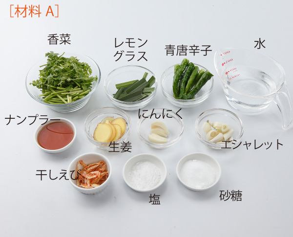 [材料A]の青唐辛子はへたをとり、エシャレットと香菜はザグ切り、しょうがは薄切り、にんにくは半分に切り芯を取る。